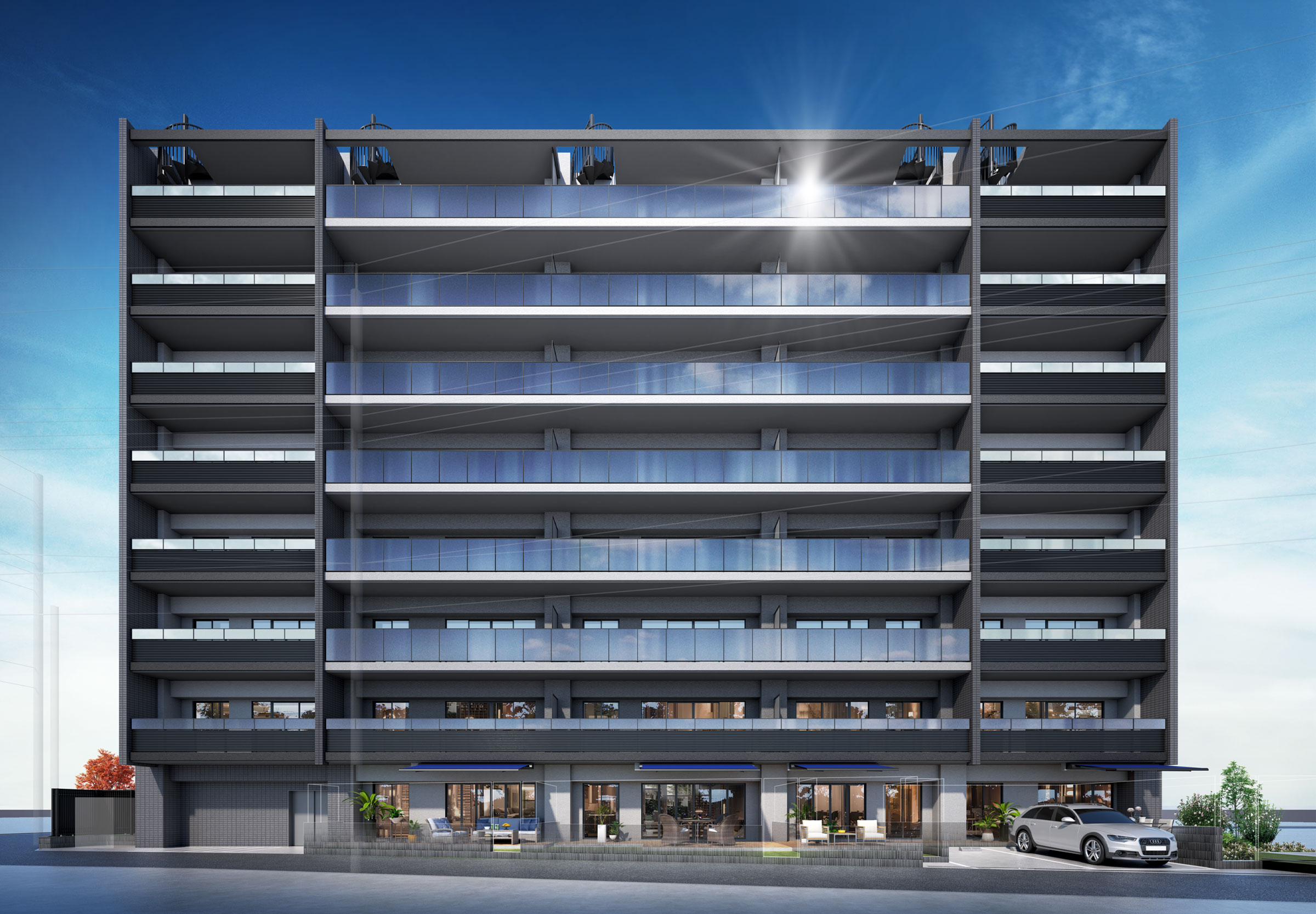 グレーを基調としたカラーが醸し出す落ち着きと、ガラス手摺がもたらす透明感。両サイドに設えた黒の横ルーバーとマリオンが、端正なシンメトリーを描き、外観に格調あるリズムを刻みます。